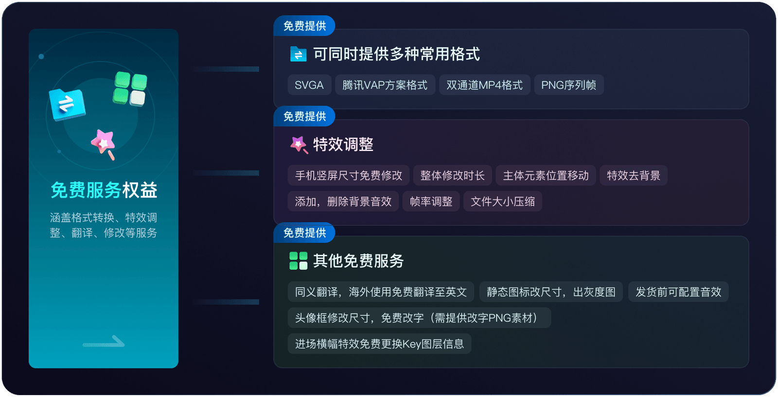 All gifts support SVGA, VAP, MP4, PAG, JSON, WEBP, GIF, MOV, and other formats